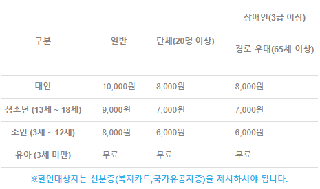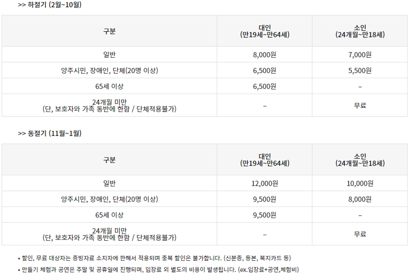 - 입장료 : 연령별 및 계절별로 상이(아래 표 참조)