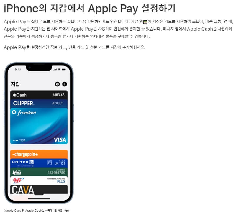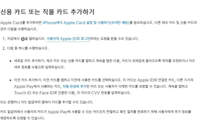 애플페이를 사용하기 위해서는 신용카드를 우선 아이폰의 월렛(지갑) 앱에 추가하는 것에서부터 시작해야 합니다. 자세한 설정 방법은 애플 코리아의 홈페이지를 참조하시면 됩니다. 편의를 위해 홈페이지 내용의 스크린샷 또한 아래에 안내드립니다.